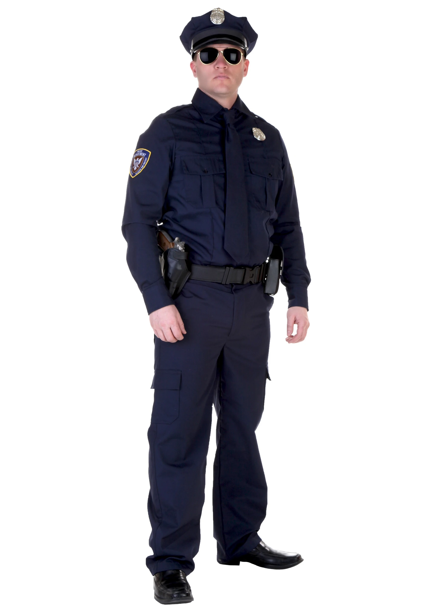 Just like a proper uniform, this outfit comes with a matching set of shirt and pants. The shirt is buttoned down the front and at the sleeve cuffs, and is accompanied by two breast pockets and police patches. The pants have a zipper fly and belt loops, and six (six!) pockets. The necktie is an actual tie, so learn your Windsor knots, and the included cap has black brim. Donโt forget to attach the pin badges to complete the look. You may even want to consider picking up a nightstick accessory to really look (but not really play) the part.